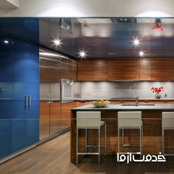 اگر قرار است در آشپزخانهتان از المانها و سایل چوبی، بتی و فلزی استفاده کنید، آبی و قهوهای میتوانند بهترین ترکیب رنگ کابینت های گلاس برای شما باشند.