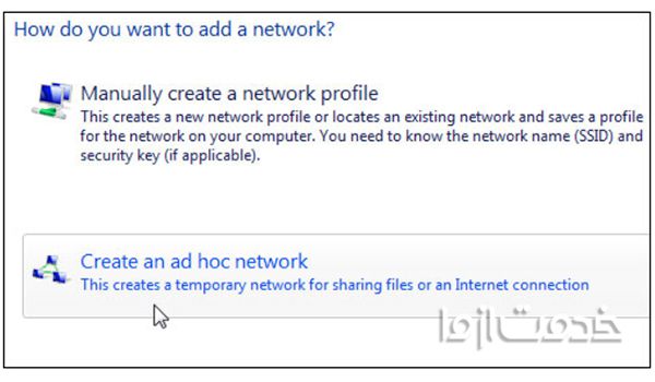 گزینه Add را کلیک کرده و Create an ad hoc network را انتخاب کنید. همانند ساخت هات اسپات در ویندوز8، در تب Sharing، گزینه Allow other users to connect through this computer’s Internet connection را تیک زده و تیک گزینه Allow other network users to control or disable the shared Internet Connection که در زیر گزینه قبلی قرار دارد را بردارید.