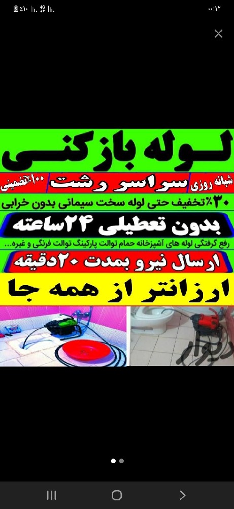 لوله باز کنی شبانه روزی با مجوز رسمی از اتحادیه وبا نرخ اتحادیه سرویس تمام نقاط رشت و حومه رشت شبانه روزی بدونه تعطیلی باز کردن لوله های توالت ایرانی و فرنگی اشپزخانه حمام پشت بام پارکینگ و غیره با ضمانت و بانرخ اتحادیه و با فنرهای جدا گانه با بیش از 20 سال سابقه کاری و زیرنطر اتحادیه و یکی از مجوز داران اتحادیه بدونه تعطیلی 24ساعته فعال بیشتر