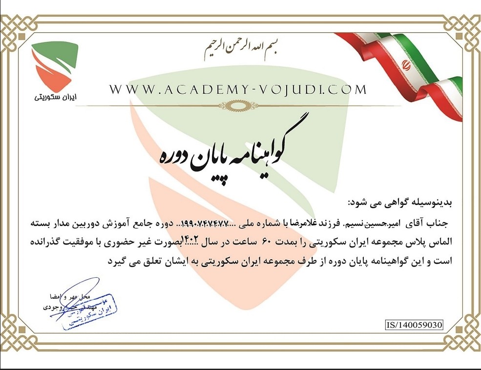 با سلام بنده امیرحسین نسیم مدیر مجموعه فنی مهندسی ایمن پرداز پیشرفته گرانول با قریب به 8 سال فعالیت های فنی امروز به عنوان کارشناس نصب تجهیزات امنیتی و راه اندازی شبکه اعم از سیستم های هوشمندسازی اماک ن، دوربین مداربسته،سیستم های شبکه، دزدگیر اماکن، سیستم های اعلام حریق و درب های برقی در خدمتتون هستم. تمامی خدمات بنده از گارانتی 6ماهه برخوردارند و اگر نصب تجهیزات هر مشکلی داشت بنده با گارانتی و قید در فاکتور در خدمتتون هستم. تمامی تجهیزات ما از پیشرفته ترین و بروزترین تجهیزات موجود در کشور هستند و افراد گروه ما همگی از افراد مجرب در تخصص خودشون هستن. شما عزیزان میتونید با خیال راحت نسبت به دریافت خدمت از ما اقدام کنید. با مجموعه گرانول شما میتونی "ایمنیت رو کسب کنی" بیشتر