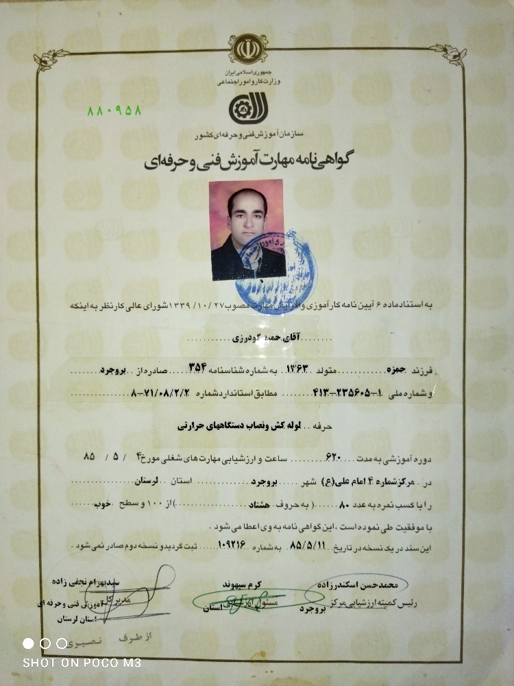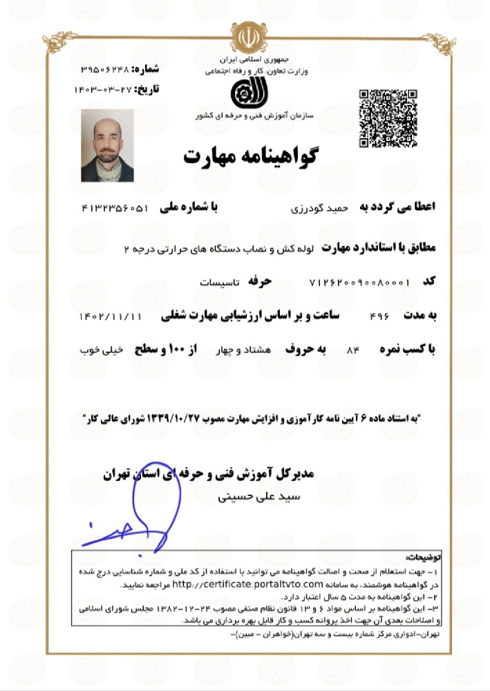 با عرض سلام و ادب خدمته مشتریان عزیز. بنده حدود 20سال سابقه در زمینه لوله کشی گاز ساختمان (فشار ضعیف) دارم. دارای مدارک معتبر از سازمان فنی حرفهای و مدرک مبحث 17 از سازمان نظام مهندسی کشور میباشم. کل یه لوله کشی های گاز (جزیی و کلی) ، گرفتن انشعاب برای اجاق گاز یا باربیکیو ، کور کردن لوله گاز اضافه بدونه کوچکترین خرابی دیوار یا کاشی ، جابجایی کنتور و هر نوع لوله کشی گاز را صفر تا صد انجام میدهم با ضمانت مادام العمر. نصب و تعمیرات موتورخانه، لوله کشی آب و فاضلاب ، جوشکاری لوله ها و منابع پوسیده ، تعمیرات مشعل های گازی و گازوئیلی ، نصب و تعمیر انواع پمپ های آبرسانی و ...از دیگر فعالیت هایی است که بنده در انها تخصص دارم. امیدوارم بتوانم با کمال افتخار در خدمتتان باشم. بیشتر