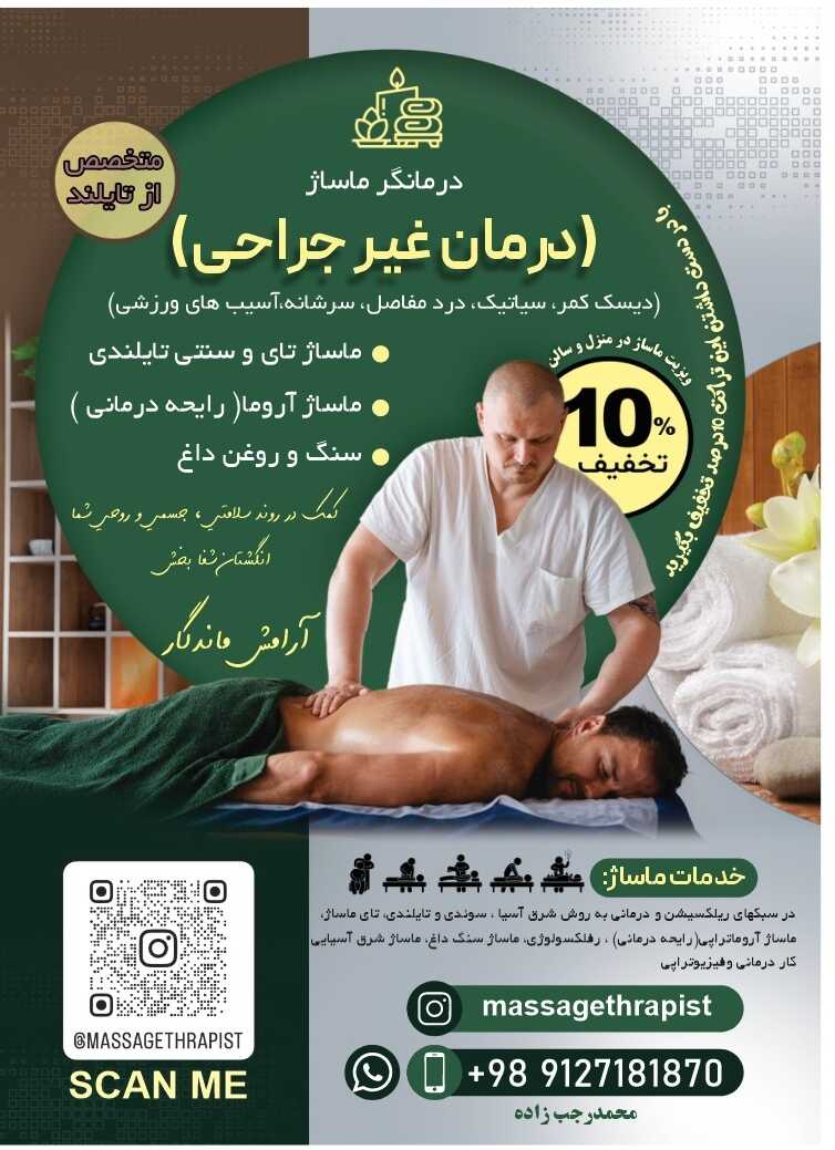 🟩🟩🟩🟩⬜⬜⬜⬜🟥🟥🟥🟥 ارائه خدمات ماساژ و کار درمانی 🟢🟢🟢🟢⚪⚪⚪⚪🔴🔴🔴🔴 درمان غیر جراحی سلام محمد هستم😊 درروند سلامت جسم و روان انسان ها. کمک میکنم 👍 10 سال است که درمانگر ما ساژ هستم و در تلاش برای فرهنگ و آداب ماساژ هستم⛩ 🏠وزیت ماساژ در منزل شما یا در سالن خصوصی و شخصی خودم 🏠 📱محدوده خیابان جیحون 📱 امکان استحمام بعد از ماساژ. 🛁 انواع خدمات 💫ورزشی 💫اسپا🎽 💫ریلکسیشن☺️ 💫سوئدی🇸🇪 💫شیاتسو 👘 💫رفلکسولوژی🌝 💫 فرم دهی ✨ 💫 کاهونا ✈️ 💫تبتی 🗻 💫تای یوگا 🧘 💫سنگ داغ🥌 💫دیپ تشیو . 💪 💫آ. شیاتسو🎍 💫درمانی. 💊 💫ماساژ لاغری با دستگاه ویبریشن🏄♂️ 💫 درمان غیر جراحی 💫سیاتیک 💫رفع دیسک کمر با دستگاه ترکشن و اصلاح ستون فقرات برای اطلاعات بیشتر. پیام دهید بیشتر