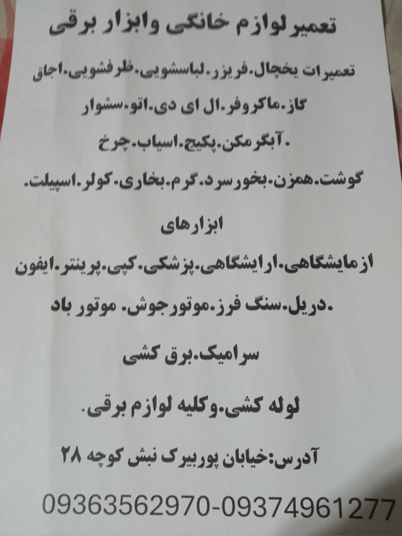 باسلام .......بدقولی نیست.بعضی مواقع درحال انجام کاری میباشیم که اون کار .گر می افتند به همین خاطر ممکن است سرساعت مقرر جهت خدمت رسانی حاضر نشویم .که ازحضور همه دوستان عذر خواهی میکنیم ...شهرام غلام پور هستم.دارای مجوز از اداره ثبت شرکتها با 29 سال سابقه کار در زمینه تعمیرات لوازم خانگی و همچنین تعمیر و نصب کلیه سیستم های برقی و هیدرولیکی و پنوماتیک. کلیه خدمات با نازلترین قیمت ارائه میشود. کلیه دستگاههای برقی در هر زمینه ای تخصص ماست به همراه کادرمتخصص و تحصیل کرده درزمینه های فنی. در صورت عدم ر ضایت از کار هیچ مبلغی دریافت نمیشود. ضمانت ما عمل ماست طراحی وساخت انواع یخچالها وفریزروابسردکنهای فانتزی .کودک.سفارشی درطرح ها وشکلهای زیبا.عکس نمونه یخچال های ساخت ما موجود میباشد.تبدیل کابینت وکمد به یخچال وفریزر... با تشکر..شرکت خدمات فنی مهندسی سایه بیشتر