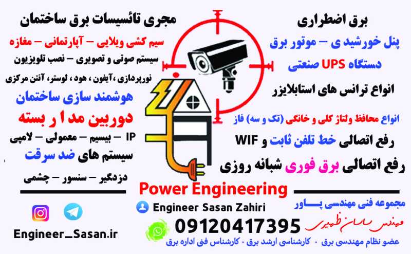 ♡لطفا جهت استعالام قیمت توافقی زنگ بزنید♡ دارای15سال سابقه کار ـ کارشناس اداره ای فوریت های برق رست ـ مهندس ناظر برق ساختمان ـ عضونظام مهندسی ـ مجری تاسیسات برق ساختمان و هوشمندسازی دوربین مداربسته ـ برق صنعتی بیشتر