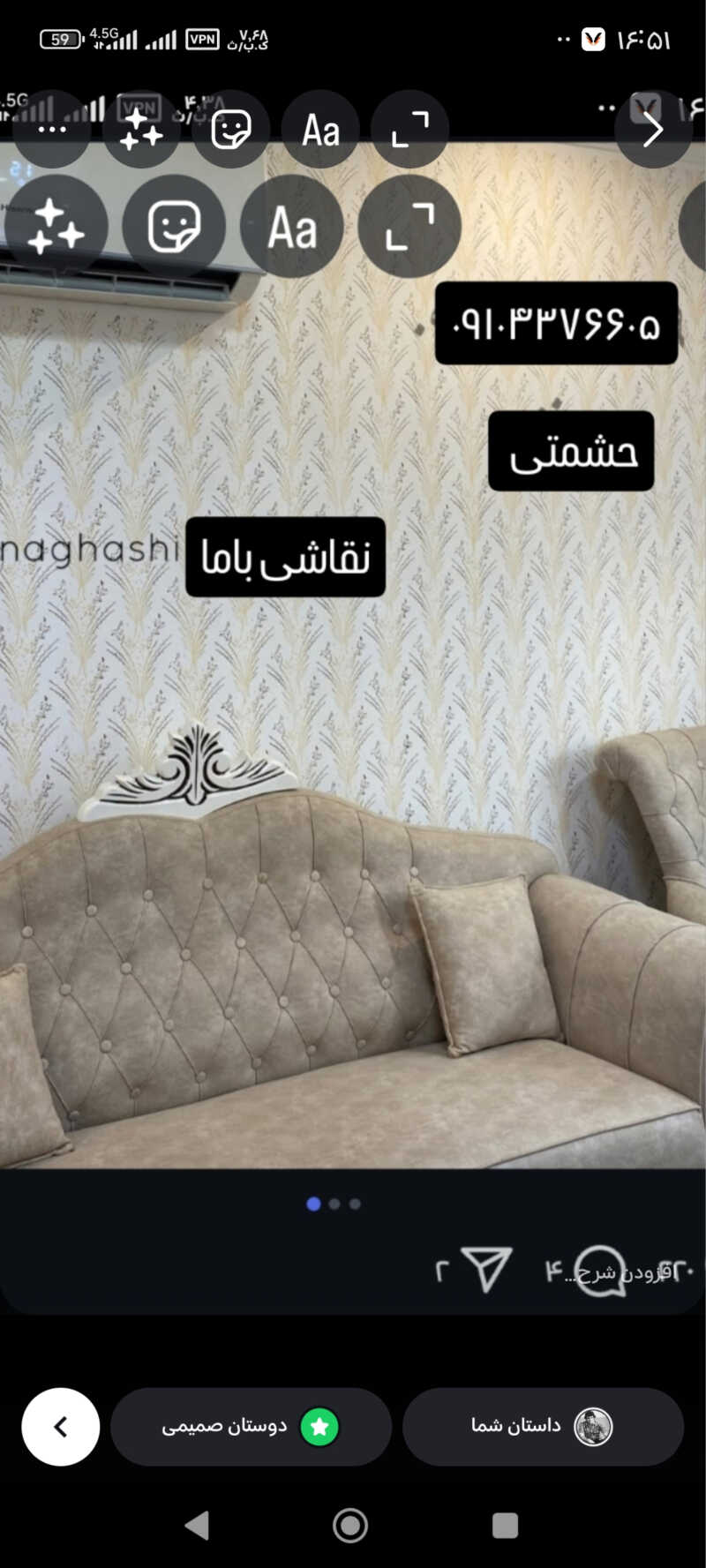 باسلام خدمت دوستان عزیزم کیفیت اتفاقی نیست.بامشاهده به قسمت نظرات مشتریان قبلی از عملکرد بنده مطلع شوید. بنده بمدت 15ساله که درزمینه خدمات نقاشی ساختمان فعالیت دارم و با تجربه و وجدان کاری کارمیک نم ازبهترین برندهای رنگ ومصالح استفاده میکنم بازدید ومشاوره رایگان. اجرای نقاشی طرح کاغذ دیواری هم پذیرفته می‌شود کار دراسرع وقت وکمترین زمان ممکن انجام میشه ودر آخرکارنظافت کاری هم انجام خواهد گرفت درصورت نیاز بصورت کتبی قراردادکاری نوشته خواهد شد.این جانب درهمه فازهای پردیس .رودهن وبومهن واکثر مناطق تهران فعالیت داشته ام .باتشکرازدوستان خدمت ازما . بیشتر