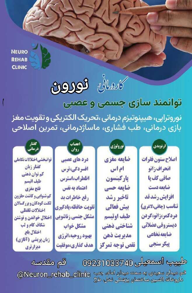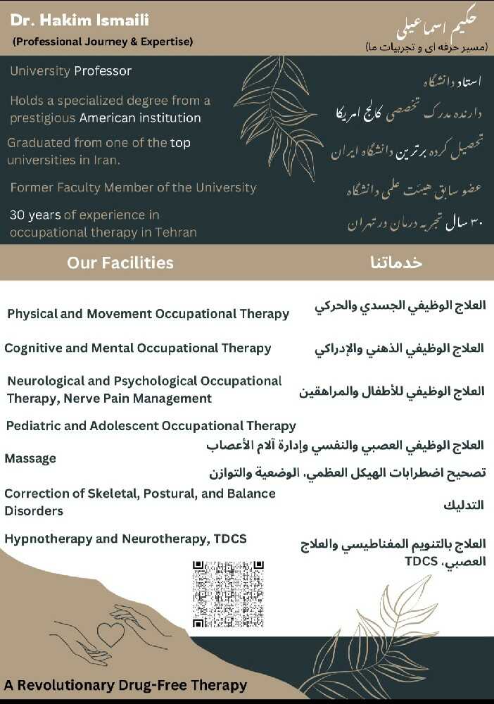 متخصص (توانبخشی ، کاردرمانی و علوم اعصاب سلامت) از دانشگاه علوم پزشکی ایران، آسیب شناسی اصلاحی قامتی و مدارک بین المللی طب مکمل (هیپنوتیزم درمانی، هیپنوانرژی، طب انرژی درمانی، نوروتراپیtdcs, کایروپراک تیک تنظیم مهره ها، ماساژ درمانی)، عضو رسمی سازمان نظام پزشکی و 20سال سابقه درمانی ، جهت درمان قطعی غیردارویی انواع مشکلات جسمی حرکتی، اختلالات مغزی ذهنی و اختلالات عصبی روانی، (ضمانت ما، کیفیت درمان همراه با سرعت روند بهبودی) بیشتر