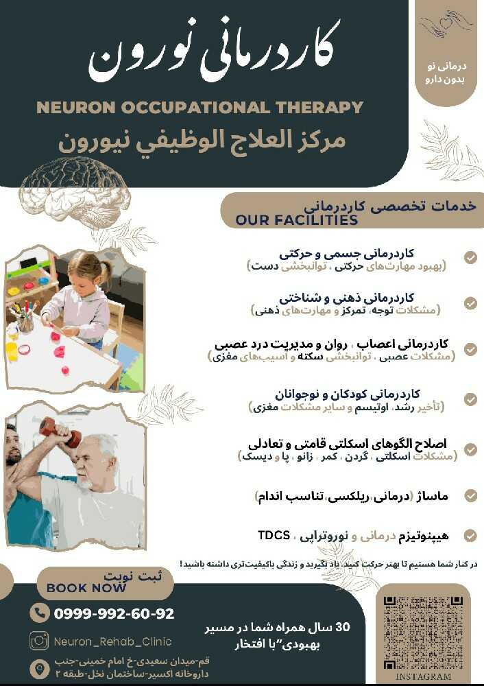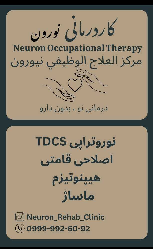 - کاردرمانی تخصصی کودکان و بزرگسالان هیپنوتیزم درمانی ، تقویت ذهن نوروتراپی TDCS ، تقویت مغز طب انرژی ، تقویت چاکرا و هاله ماساژ درمانی ، ماساژ ریلکسی، طب فشاری مشاوره انواع مشکلات اعصاب تقویت روحیه و اعتماد بنفس و انرژی + ارایه فاکتور رسمی با مهر نظام پزشکی تخفیف ویژه با معرفی مراجعین جدید انجام مشاوره تلفنی و آنلاین درمان ریشه ای مشکل و اختلال