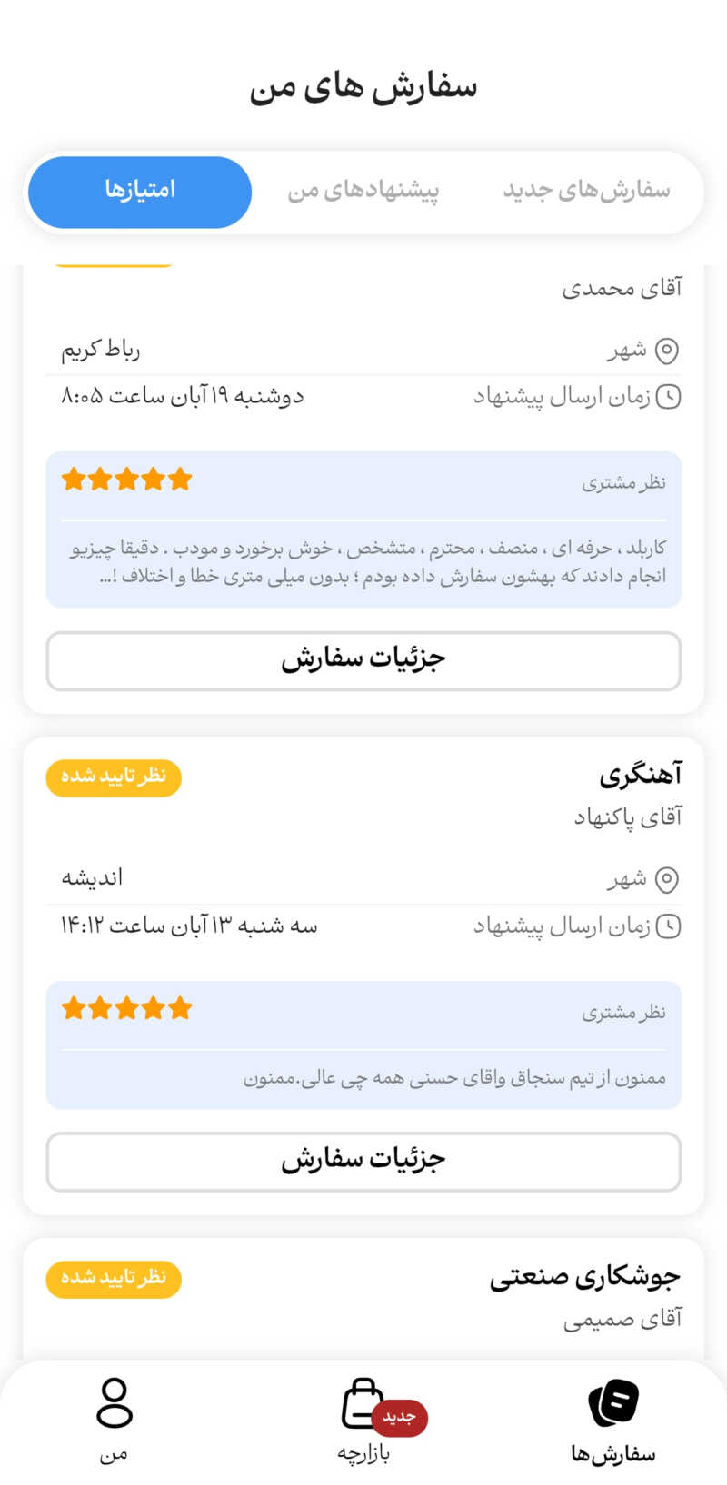 مشتریان بابت کیفیت انجام کار ، دستمزد منصفانه ، مهارت و تخصص ، رفتار محترمانه به محسن حسنی امتیاز مثبت داده اند.