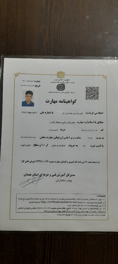 با سلام بیشتر از چندین سال هس که سابقه مستمر در زمینه پکیج و شوفاژ به صورت تخصصی دارم 📎 دارای مدرک معتبر فنی حرفه ای در تخصص پکیج و شوفاز📎 دوره های بروز و جدید انواع پکیج را گذراندم📎 انگیزه و علاقه کا فی برای این کار را دارم📎 نصب،عیب یایی و تعمیر انواع پکیج دیواری و ابگرمکن دیواری همراه با بازدید اولیه رایگان و قیمت مناسب بیشتر