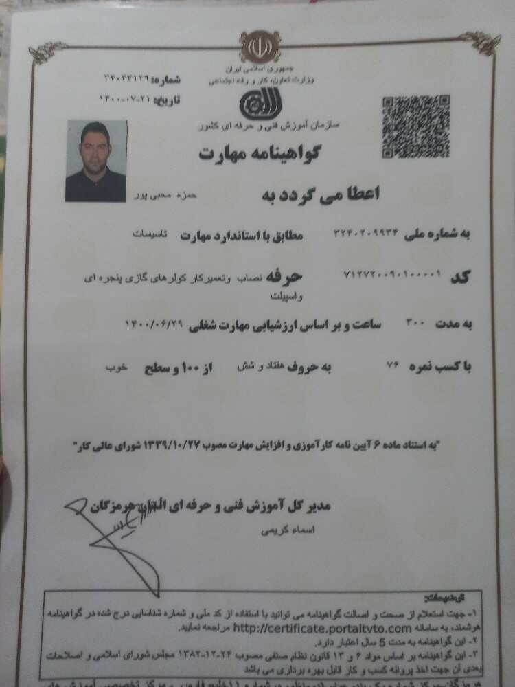 با سلام من بیشتر از 8 سال سابقه خدمات صفر تا صد تهویه مطبوع اعم از کولر ،اسپیلت،ایستاده،یخچال های خانگی و صنعتی،پکیج رو دارم ..انجام کار تمیز همراه با تعهد و رضایت مشتری جزو سوابق بنده میباشد ب همراه فاکتور و مهر و مدرک معتبر بیشتر