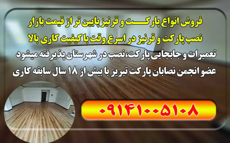 با سلام نصب انواع پارکت و قرنیز در اسرع وقت با دقت و کیفیت کاری بالا بصورت تضمینی دوستان دقت و زیبایی و کیفیت و در عین حال بی نقص بودن کار برای جلب مشتری اولويت کاری ماست کار خود را با خیال راحت به ما بسپارید عضو انجمن نصابان پارکت تبریز با بیش از 18 سال سابقه کار بیشتر