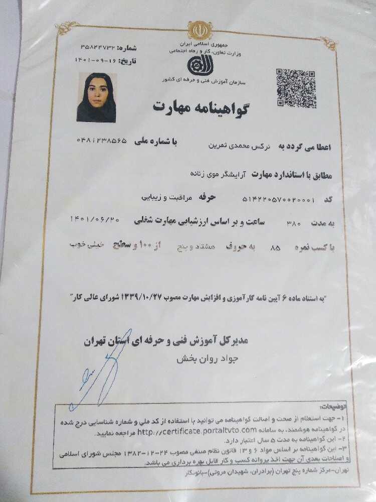 نرگس محمدی هستم 5 سال سابقه کار در لاین بافت مو براشینگ و دیزاین مو را دارم از متریال عالی برای مشتریانم استفاده میکنم و رضایت مشتری برام اولویته در کنار این لاین ها اصلاح صورت و ابرو کاشت مژه موقت هم انجام میدم بیشتر