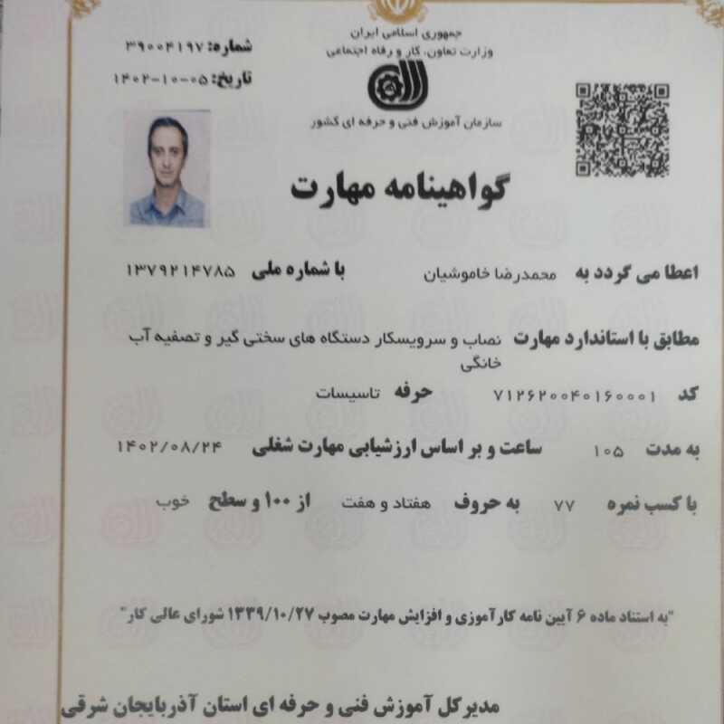 • دارای مدرک معتبر از سازمان فنی و حرفه ای هر 6 ماه بازدید رایگان در صورت احتیاج تعویض فیلتر و.. ارایه فاکتور با مهر و امضا گارانتی خدمات و لوازم حل مشکل بصورت تلفنی