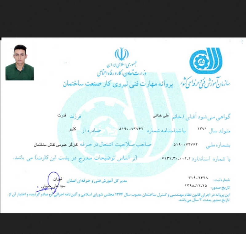 دارای 14 سال سابقه کار عضو انجمن خانه کارگری دارای کارت مهارت نقاشی از سازمان فن و حرفه ای کشوری