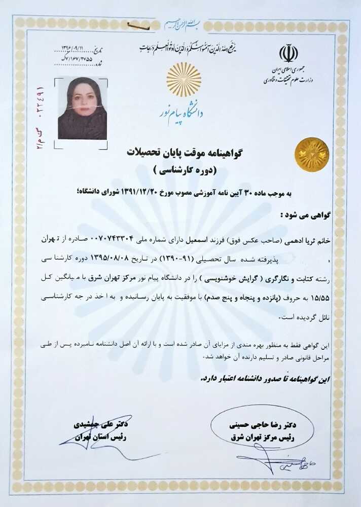 فارغ التحصیل فوق ممتاز از انجمن خوشنویسان تهران کارشناس کتابت و نگارگری گرایش خوشنویسی با بیش از 20سال سابقه تدریس و انجام سفارشات خوشنویسی