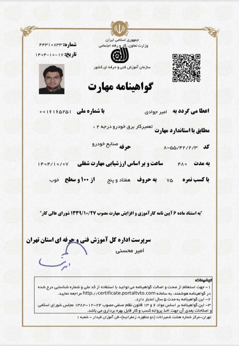 با سلام بنده با 2سال سابقه کار تعمیرات برق خودرو انجام خدمات مربوطه عیب یابی و رفع عیب را با دقت و با استفاده از ابزار های دقیق صورت می‌گیرد