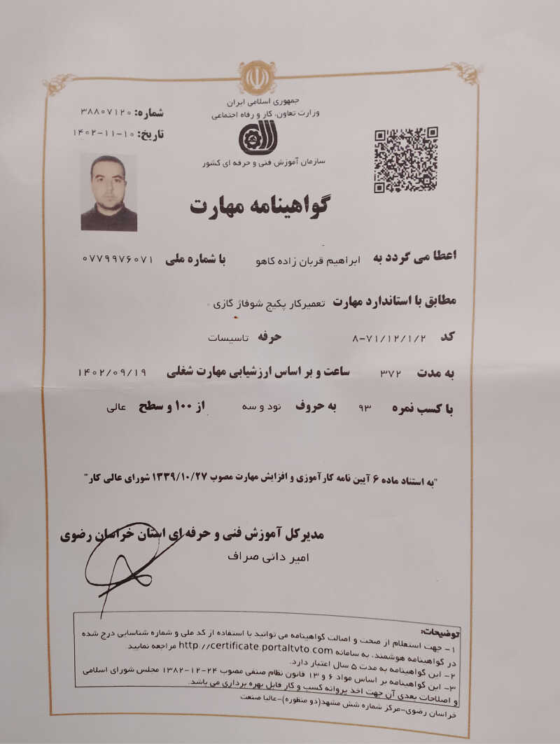 من بیش از 15 سال سابقه کار در زمینه لوله کشی و نصب وسایل بهداشتی ورفع نم و ترکیدگی لوله دارم و بنا به پیشنهاد شما از متریال مناسب با درخواست شما کارم را انجام میدهم. با ارائه فاکتور و ضمانت و تعهد بعد از انجام کار بیشتر