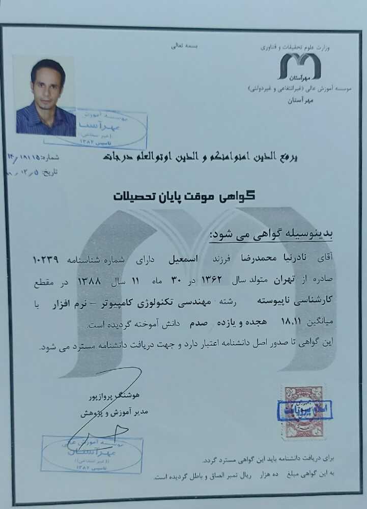سلام، من محمدرضا نادرنیا هستم، مهندسی کامپیوتر خوندم و می تونم به صورت حرفه ای و با کیفیت و قیمت مناسب تمام امور مربوطه به خدمات کامپیوتری رو برای شما انجام میدم.
