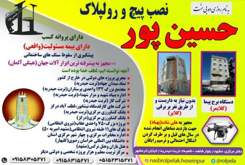 بنام روزی ده بی منت، مجهزترین نصاب رولپلاک در خراسان بزرگ .نصب رولپلاک حسین پور با دو دهه تجربه کار در ارتفاع و استحکام سازی نما ؛ بدون نیاز به داربست با استفاده از دستگاه برج پیما کلایمر و دستگاه نفر بر برقی کلایر ، دریل های بدون ضربه هیلتی و مته های خودتیزشونده، دارای پروانه کسب و بیمه مسولیت و از همه مهمتر ؛تحویل برگه ضمانت و البته نصب پلاک ضمانت بر بدنه ساختمان بعد از اتمام کار ،در خدمت هم استانی های عزیز در خراسان بزرگ میباشد ،موفقیت بعد از انضباط است...رولپلاک حسین پور متشکرم پروردگار بیشتر