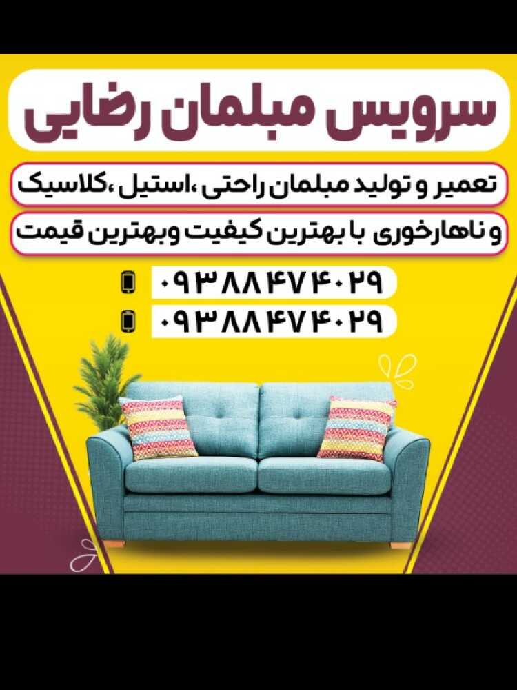 سلام مبلمان رضایی بابیش از 15سال سابق کار درخدمت شما مشتریان عزیز هست مبلمان رضایی در تخصص مبلمان . راحتی واستیل کلاسیک وناحارخوری رنگ مبلمان وناحارخوری وسرویس خواب درخدمت تمام مشتریان عزیزهست مبلمان رضایی بخاطر راحتی شما مشتریان عزیز تمام سرویس های رفت وبرگشت بر عهده خود گرفت است بخاطر اعتماد شما مشتریان عزیز اگر خدای نکرده کارشما به مشکل بخور هرجا باشما شهرستان وتهران باش فرق نمیکن برعهده خود میگیره وضمانت ما کیفیت مااست کیفیت بهتر ....قیمت بهتر ... کیفیت بهتر... قیمت بهتر... کیفیت بهتر...قیمت بهتر... مبلمان رضایی درخدمت شما هست.... بیشتر