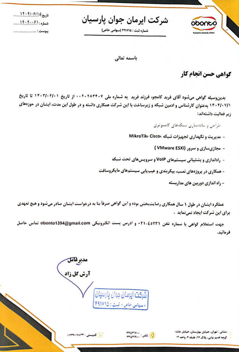 با سلام و احترام،مجموعه ما با 10 سال سابقه در زمینه شبکه های کامپیوتری و زیرساخت اعم از سرور،فایروال،سوئیچ،روتر،تلفن سانترال و IP،دوربین مداربسته و صفر تا صد راه اندازی زیر ساخت شبکه مشغول فعالیت هستش و همچنین تجربه همکاری با ارگان های دولتی و خصوصی همچون آتش نشانی دارم و خدمات مشاوره و راه اندازی همراه با پشتیبانی رایگان بعد از کار با پروتکل امنیتی و استاندارد و قیمت مناسب ارائه میدهم.بابت کیفیت و امنیت کار خیالتون راحت باشه کافیه یکبار اعتماد کنید و مجموعه مارو انتخاب کنید پشیمون نمیشید. بیشتر