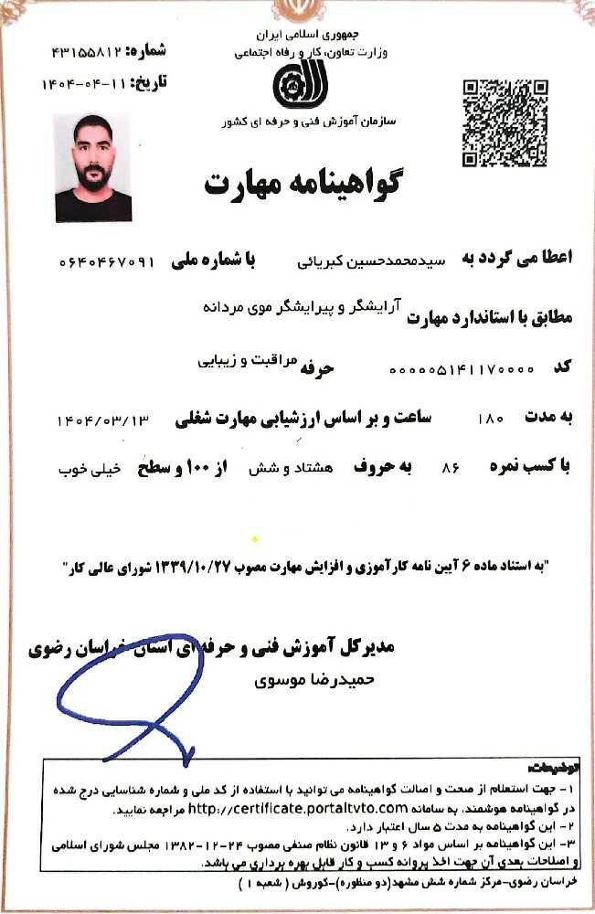 - اصلاح کلاسیک و مردانه نسبت به فرم صورت ، کوتاهی و حالت . آموزش کامل روتین های پوست و مو برای شادابی پوست ، و جلوگیری یا قطع ریزش مو ، و رویش مجدد مو ... آموزش پاکسازی تخصصی پوست ، پروتیین تراپی مو. انجام تمامی کار های کامپیوتری: نصب ویندوز/کرک/وی پی/ و غیره
