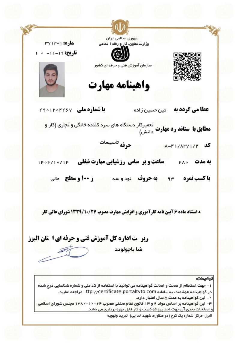 من متین حسین‌زاده تعمیرکار یخچال، فریزر و آب‌سردکن خانگی و صنعتی دارای مدرک فنی‌وحرفه‌ای و تخصص در عیب‌یابی دقیق و تعمیر اصولی. من هر دستگاهی رو طوری تعمیر می‌کنم که انگار مال خودمه؛ با دقت، انصاف و ت وجه به جزئیات تا خیالتون از نتیجه راحت باشه. بیشتر