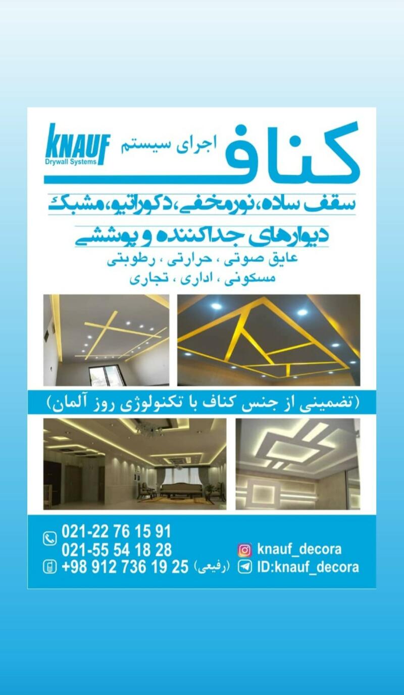 عرض ادب خدمت مشتریان گرامی : اجراء سقف و دیوار کناف با متریال اصلی کناف ایران با 14 سال سابقه اجراء مسکونی،اداری،تجاری (دکوراتیو،نورمخفی،ساده) دارای گواهینامه اجرایی از شرکت کناف ایران آماده خدمت رسان ی در تمام نقاط تهران و حومه هستیم اعم از پروژه های متراژ بالا و بازسازی همراه با ضمانت نامه کتبی بیشتر