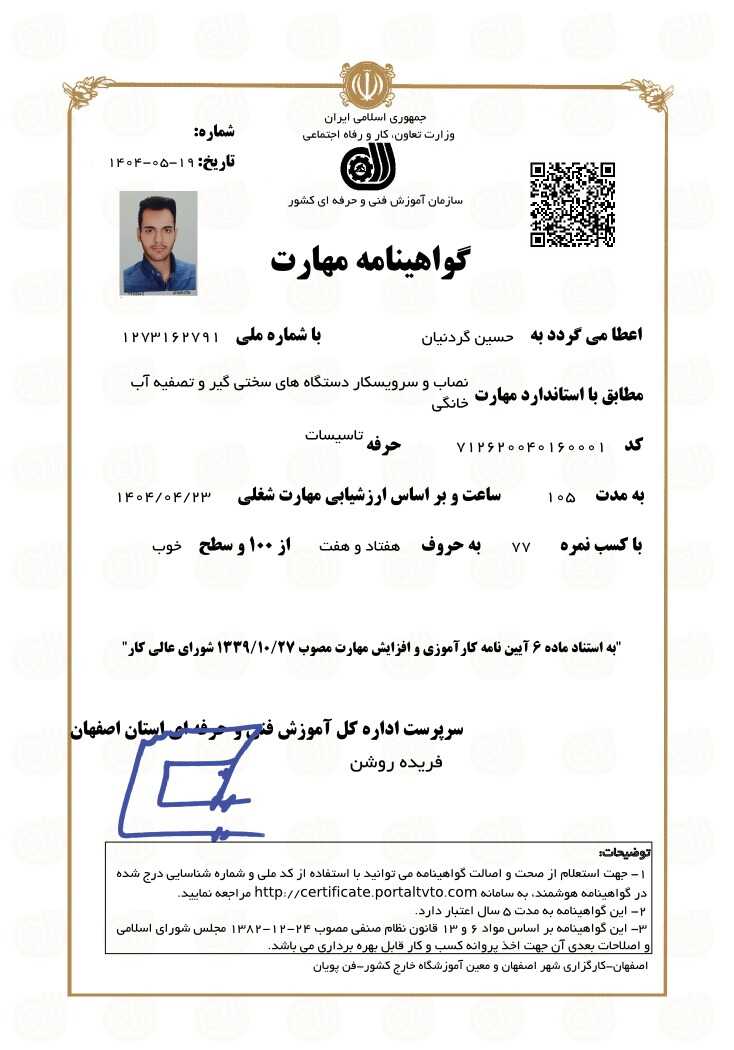 مشتریان بابت رفتار محترمانه ، کیفیت انجام کار ، مهارت و تخصص ، خوش قولی ، دستمزد منصفانه به حسین گردنیان امتیاز مثبت داده اند.
