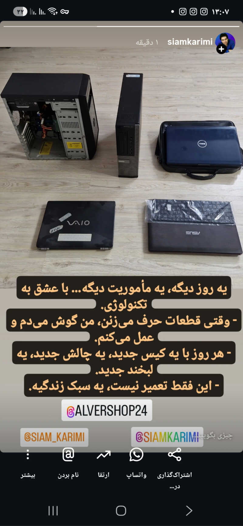 درود⚘️، اینجانب سیام کریمی، کارشناس ارشد شبکههای کامپیوتری با مدرک فوقلیسانس و بیش از 20 سال سابقهی رسمی و درخشان در یکی از سازمانهای دولتی تهران هستم. در طول این مدت، تجربهی گستردهای در حوزه آی تی، شامل نصب و راهاندازی انواع سیستمعاملها (ویندوز، لینوکس، مک و سرور)، نصب و پیکربندی نرمافزارهای کاربردی و تخصصی، مدیریت و نصب آنتیویروسها، عیبیابی و تنظیمات مودمهای ADSL، تعمیرات تخصصی کیس و لپتاپ، ارتقا و بهینهسازی سختافزار، رفع ایرادات مادربرد، هارد و ... و همچنین ریکاوری اطلاعات انواع هارد ، رم و همچنین در زمینهی مشاوره و فروش لپتاپهای آکبند ، استوک دست اول بدون خط و خش و بدون دستکاری با ارسال مستقیم از دبی فعالیت میکنم ،تأمین انواع لوازم جانبی کامپیوتر و گجتهای دیجیتال و الکترونیکی بخشی از خدمات من است. در بسیاری از شرکتها بهعنوان کارشناس HelpDesk از طریق نرمافزارهای ریموت کنترل فعالیت دارم و خدمات پشتیبانی را بهصورت آنلاین ارائه کردهام. تمامی خدمات با ضمانت کیفیت و رضایت مشتری همراه است و در صورت نارضایتی، بازگشت وجه تضمین میگردد. رضایت مشتری خیلی ارزشمنده بیشتر