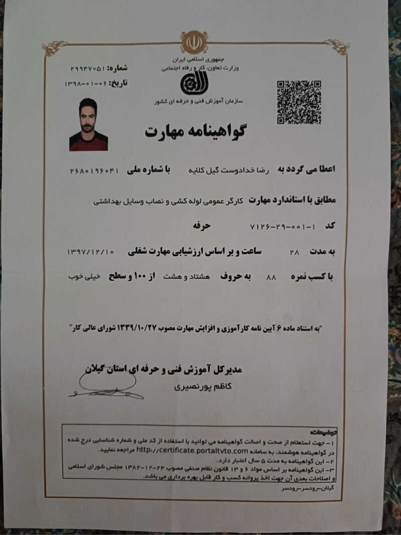 درود.من بیشتر از12سال هست که در زمینه تاسیسات فعالیت دارم.روز های سختی رو پیش رو گذاشتم تا تونستم رو پای خودم باشم. تو کارم همیشه سعی کردم فرد وقت شناس.منصف.با شخصیت.خوش اخلاق و مسئولیت پذیر باشم و تونستم اعتماد مشتری رو جلب کنم.کارم نسبت به سایر استاد کارها کمی فرق داره اونم اینه که تمیزی توی کار و رخت و لباسم برام اهمیت داره و چون بیشتر کار ها در منزل مشتری انجام میشه سعی میکنم با کمترین آلودگی کار و به سرانجام برسونم چون رضایت مشتری الویت کارمه.درکارم فاکتور ارائه میدم و در صورت نارضایتی شما مشتری های عزیز مبلغی دریافت نمیکنم.یکی از خصوصیت های خوبم اینه که اگه زمانی مشاوره بخواین رایگان مشاوره ومشورت میدم.و از همه مهم تر بزای بازدید کار هیچ مبلغی نمیگیرم تا کاریو یه اتمام نرسونم.امیدوارم لایق باشم و مورد توجه و انتخابتون باشم. بیشتر