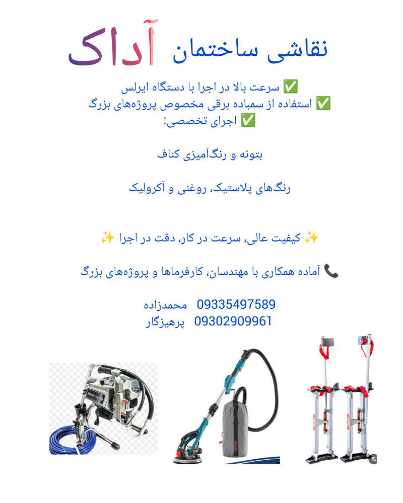 سلام به مجموعه آداک دکور خوش آمدید ما مجری دکوراسیون داخلی هستیم از طراحی تا اجرا (نقاشی‌ساختمان .کاغذدیواری . کفپوش و پارکت . دیوارپوش . کابینت و کمد دیواری . فضای سبز و... ) با ما خیالتان راحته کلی ه کارهای زیباسازی منزلتون رو به مجموعه آداک دکور بسپارید بیش از 20 سال سابقه ضامن کیفیت کار ماست بیشتر