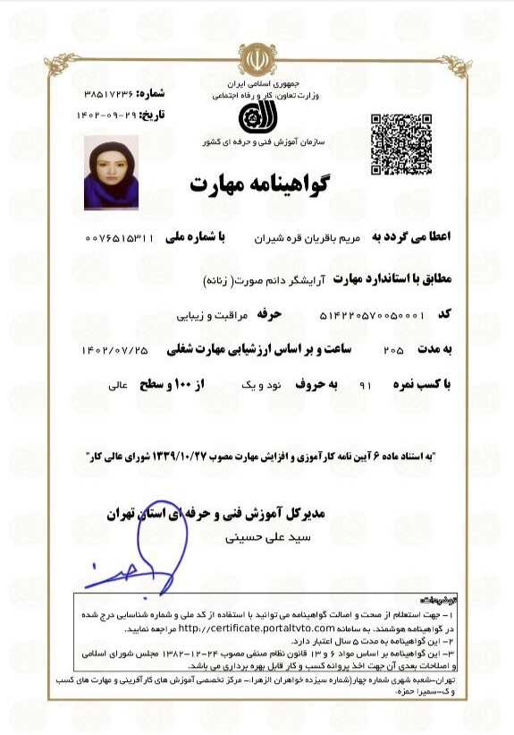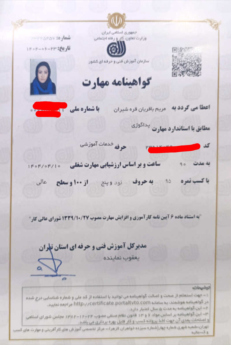 - یکی از خدمات ویژهای که به هنرجوهام ارائه میدم اینه کهبعد از پایان دورههای آموزشی، در صورت آمادگی هنرجو، برای شرکت در آزمون سازمان فنی و حرفهای معرفی میشن.در طول دوره، آموزشها بر اساس استانداردهای فنی و حرفهای انجام میشه تا هنرجو فقط آموزش نبینه، بلکه برای ورود رسمی به بازار کار هم آماده باشه.همراهی من تا مرحلهی آمادگی آزمون ادامه داره و مسیر بهصورت شفاف و اصولی توضیح داده میشه.