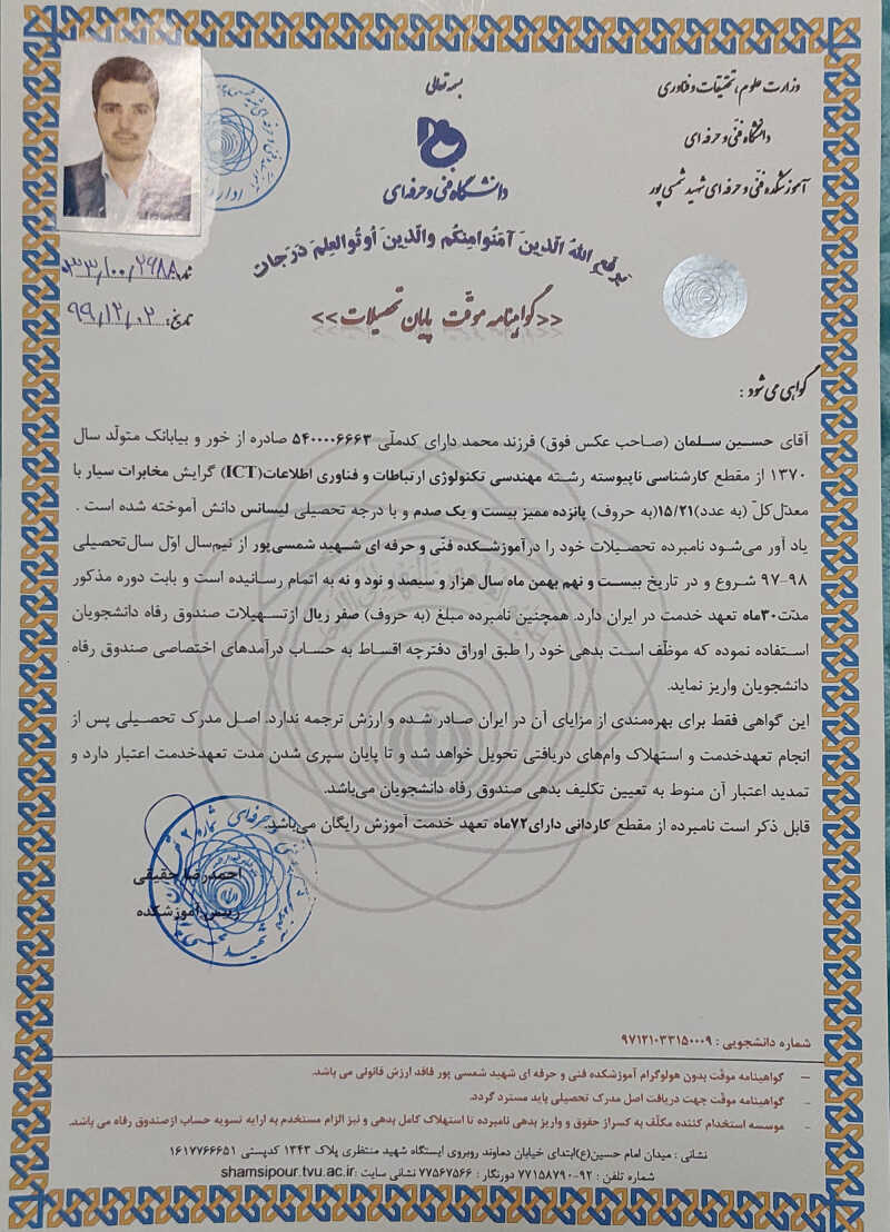 سلام من کاردانی برق دارم و کارشناسیict و 6 ساله که در زمینه های برق ساختمان، شبکه، و تعمیرات لپ تاپ و PC در حال کار هستم. در صورتی که از کار بنده رضایت نداشته باشید تمام وجه عودت داده می‌شود.