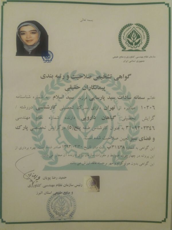 به نام خالق زیبایی ها، آمده ایم، با هنر، خلاقیت و توانمدیهایمان، و با توجه به در خواست و بودجه شما از مواد باکیفیت و مناسب استفاده کنیم و منظره ای رویایی را برای شما خلق کنیم، تا در آن لذت ببرید. _م هندسی با ۹ سال تجربه حرفه ای *_دارنده گواهی تشخیص صلاحیت و رتبه بندی پیمانکار حقیقی از سازمان نظام مهندسی، در گرایش تخصصی فضای سبز *_گواهی تشخیص صلاحیت و رتبه بندی پیمانکار حقیقی از سازمان نظام مهندسی، در گرایش امور باغبانی دارنده گواهی های بین المللی در زمینه: _مدیریت پروژه فضای سبز _طراحی فضای سبز _آبیاری قطره ای _تغذیه باغات _ هرس فرم دهی و آرایش گیاه _هرس اصولی درختان میوه _ مدیریت تولید گیاهان دارویی ارگانیک _پرورش دهنده گیاهان دارویی _باغبانی و پیوند ********** خلاق در طراحی های نوین، با گروهی حرفه ای و مجرب و متخصص، در زمینه: ✏_ارائه طراحی۳ بعدی فضای سبز (Landscape). _طراحی و احداث انواع سبک ها مدرن، سنتی و ترکیبی _ طراحی و احداث انواع باغهای بین المللی: باغ سنگی، باغ ژاپنی، باغ ایرانی، باغ انگلیسی. _ طراحی و احداث بام سبز، دیوار سبز ⛱_ طراحی و اجرای ان بیشتر