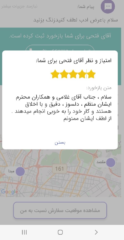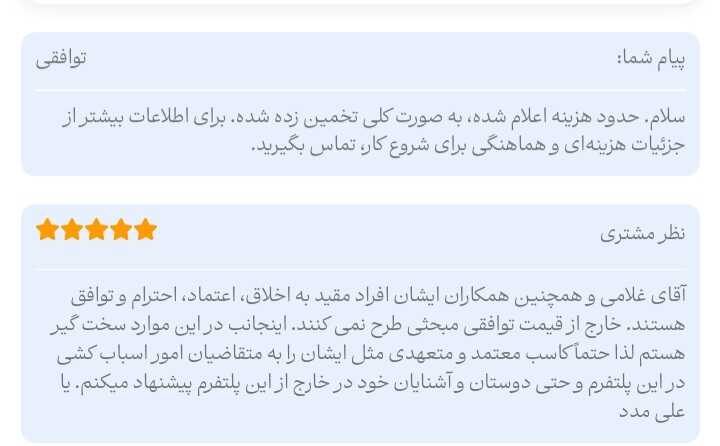 مشتریان بابت رفتار محترمانه ، کیفیت انجام کار ، دستمزد منصفانه ، مهارت و تخصص ، خوش قولی به هوشنگ غلامی امتیاز مثبت داده اند.