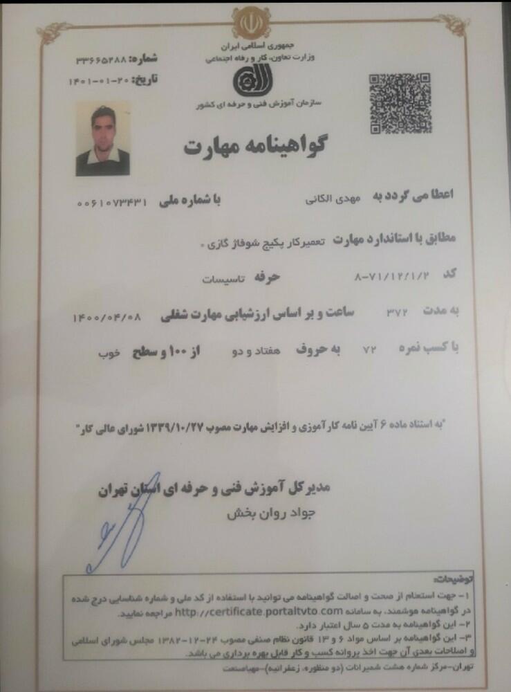 20سال سابقه کار تاسیسات دارم مدرک بین المللی تعمیرات پکیج وابگرمکن دارم متخصص در أمور كولر ابي