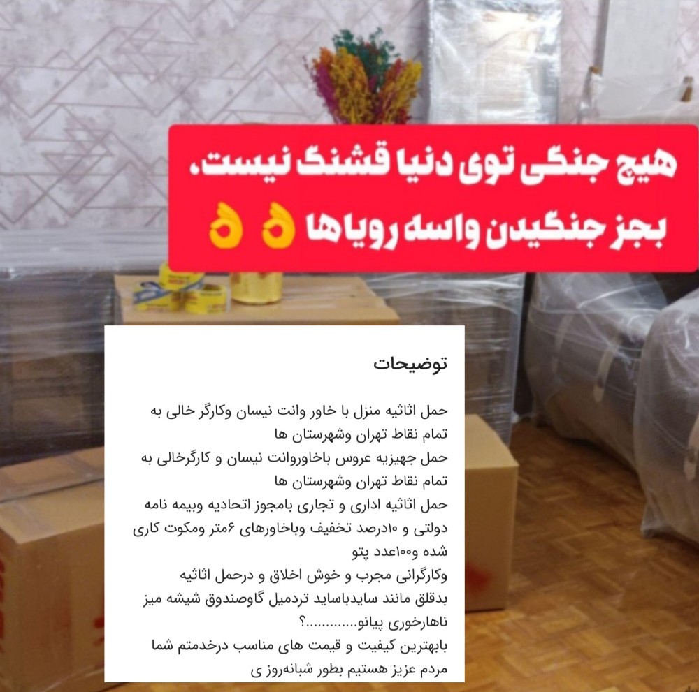 باسلام بیشتراز 9سال سابقهکاردارممتخصصدرحملاسبابمنزل کالایاداریتجاری اعزامکارگرخالیجهت تخلیهبارهایشهرستانبستهبندیحرفهای باچسبکارتونبابلواسترجدرخدمتشما هستیم.