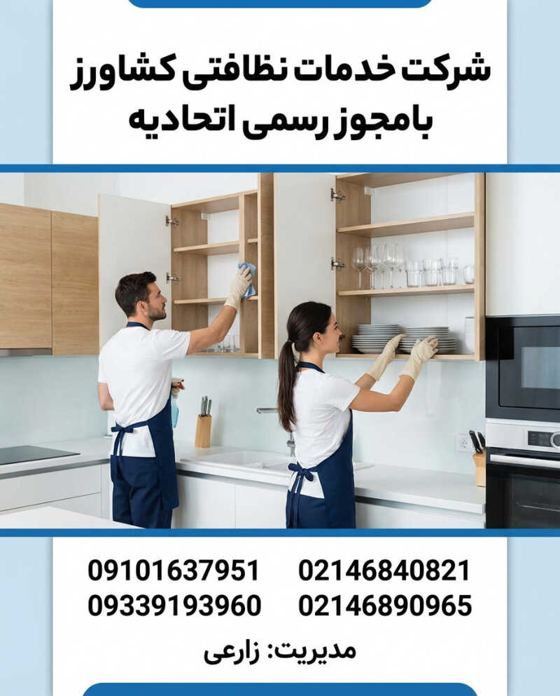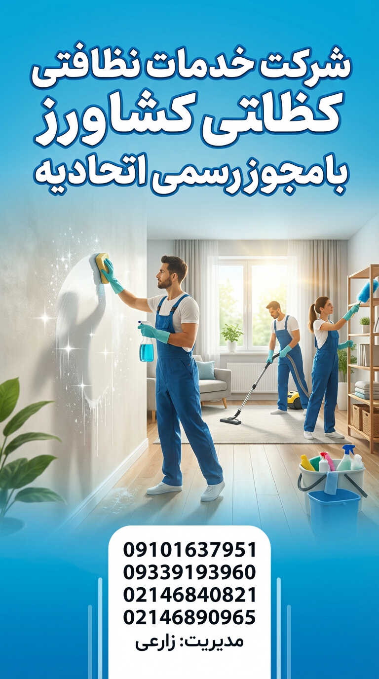 دفتر خدمات نظافتی کشاورز با مجوز رسمی اتحادیه با 15سال سابقه کاری در زمینه نظافت بیش از 1000مشتری دایم موفق در زمینه نظافت داشته است.اولیت اول کار مشتری و پیگیری و رسیدگی مشتری انتقاد و پیشنهاد درباره نظافت ودر نحو پیشرفت تمام پرسنل وتمیزکار ما آموزش دیده حرفه ای و مسولیت پذیر انجام تمام کارهای خونه شامل گردگیری .شستشو.اصول کار این هست مشتری بدونه که نیرو تمیزکار از چه مواد شوینده استفاده میکند تمام نیروها باید یادگرفته باشند طرز تمیز کردن دیوار حموم سرویس بهداشتی از چه نوع مواد استفاده کنند این نیرو بهش میگن نیرو حرفه ای اول نیرو وارد منزل میشود نیرو حرفه ای بلد باشد از کجای منزل شروع کن مشتری باید آنقدر اطلاعات بالا داشته باشد که نیرو را بسنجه از ساعت اول متوجه بشه که نیرو خوبی هست یا خیر تمام نیروها بیمه شده و آموزش دیده هستن خدمت رسانی به تمام نقاط شهر قدس شهریار اندیشه گرمدره وردآورد چیتگر شهید خرازی پیکان شهر شهرک دانشگاه شهرک استقلال شماره تماس 09101637951 09339193960 021468040821 02146890965 با مدیریت: زارعی بیشتر