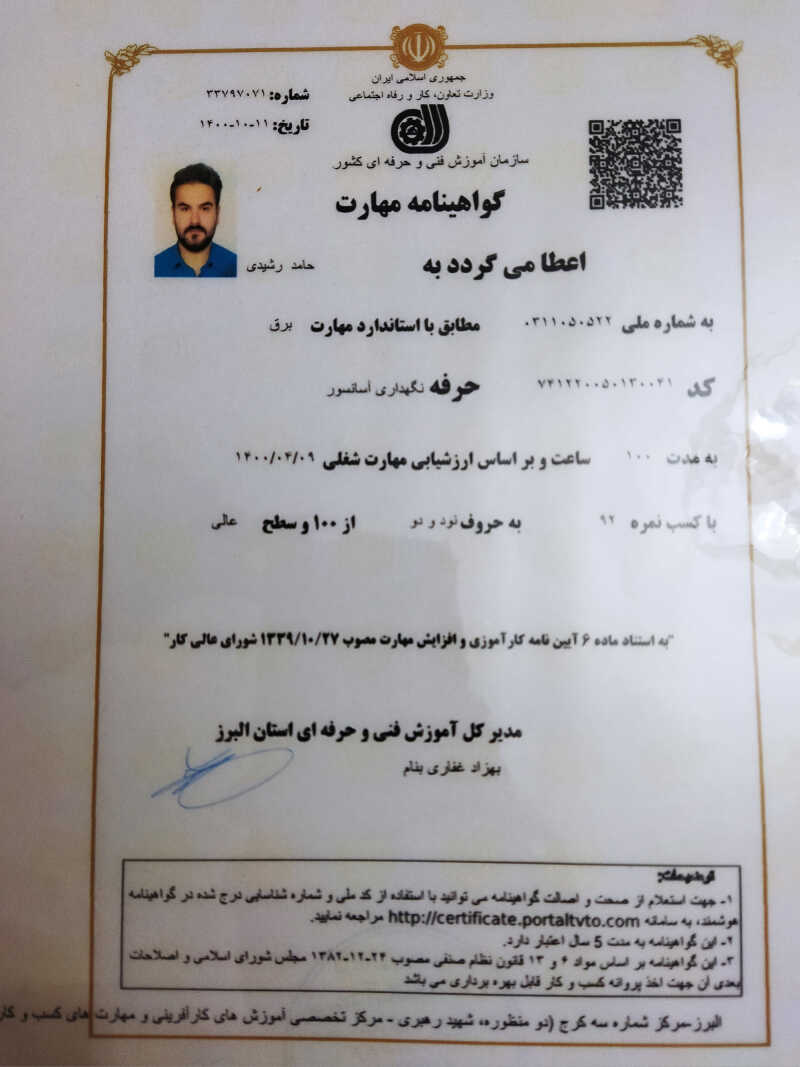 شرکت فنی مهندسی حامیان آسانبر البرز مزایای همکاری با ما در خصوص سرویس اسانسور *رفع خرابی اسانسور شما در همان روز *داشتن انواع قطعه و معطل نشدن مشتری برای خرید قطعه *رفع خرابی حتی در روز های تعطیل *خ وش قول بودن و خوش انصاف بودن در اجرت و فروش قطعه با سلام بنده با بیش از 10 سال تجربه کاری بصورت تخصصی در بحث اسانسور و پله برقی دارای مدرک کارشناسی اسانسور سازی و پله برقی و مهندسی الکترونیک صنعتی و همینطور مدارک نصاب،سرویسکار،تعمیرکار تخصصی اسانسور از سازمان فنی حرفه ای استان البرز می‌باشم تخصص بنده در راه اندازی آسانسور و سرویس نگهداری و تعمیرات اسانسور هست نصب صفر تا صد هر نوع اسانسور اعم از هیدرولیک ،گیرلس، روملس و کششی بازسازی انواع اسانسورتعمیرات موتورگیربکس با ضمانت سرویس و نگهداری ماهیانه و جنرال سرویس تعمیرات تخصصی اسانسور با ضمانت فروش قطعات و لوازمو... تعویض تراول ، سیم بکسل ، تابلو فرمان و... دارای مجوز رسمی از اتحادیه کشوری آسانسور و پله برقی آسانسور قلب ساختمان است و مسئولیتی سنگین برای مدیر ساختمان لطفا گول قیمت های پایین و بی اساس رو نخورید بیشتر
