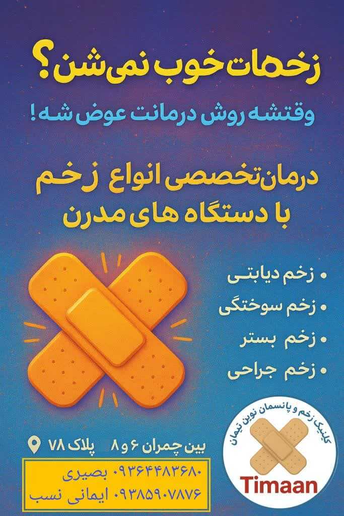 • کارشناس تخصصی زخم(زخم جراحی،سوختگی،دیابت،مراقبت از استوماو...)،مشاوره تلفنی رایگان،دریافت حداقل هزینه جهت ویزیت اولیه در کلینیک زخم تیمان دارای دستگاه های پیشرفته زخم از قبیل(انواع پانسمان های نوین ،وکیوم تراپی،پلاسما،prpو...)