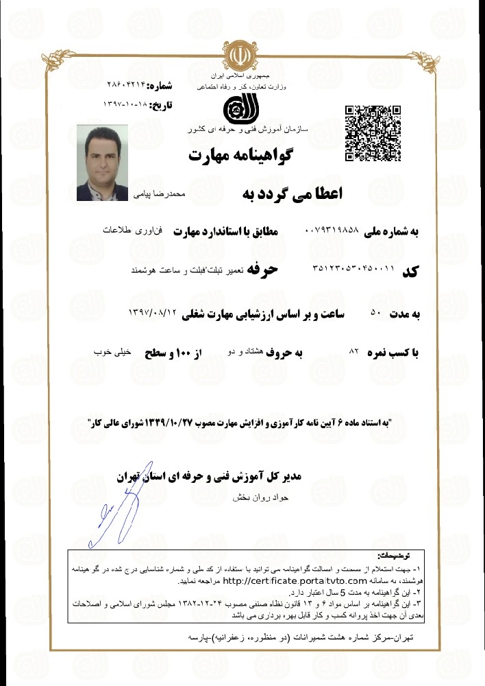 دارای شش سال سابقه. کاردارای مدرک فنی حرفه ای .دارای مدرک مؤسسه انفورماتیک پارسه. عیب یابی تخصصی .تعمیر مدار شارژتعمیر و تعویض انواع کانکتور ها و ال سی دی .تعویض هارد اندروید ریبال سی پی یو و.....